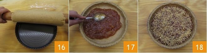 Place the hazelnut shortcrust pastry in a 9.5-inch diameter pan, if you're not using a perforated mold, you will need to butter and flour it 16, then pour the fig jam 17 and spread it over the entire surface of the pastry using a spoon. Sprinkle with hazelnut crumbs 18.