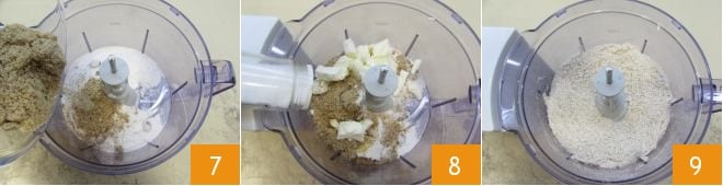 Proceed to prepare the hazelnut shortcrust pastry. In a mixer, add the all-purpose flour together with the hazelnut flour 7, then add the cold butter in small pieces and a pinch of salt 8. Blend for a few moments at high speed until you obtain a sandy mixture 9.