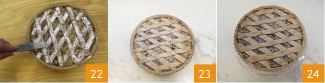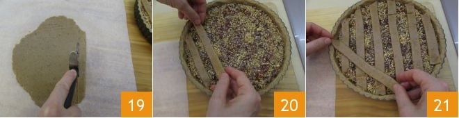 Roll out the leftover hazelnut shortcrust pastry and cut into strips about 0.8 inches wide, cut them with a smooth wheel 19 and place them on the tart, laying them first in one direction 20 and then the other 21, to form a lattice pattern.