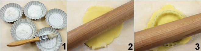 Butter and flour well 6 tartlet molds with a diameter of about 3 inches each 1. After resting in the fridge, roll out the shortcrust pastry into a sheet about 1/8 inch thick with the help of a rolling pin 2, cut it into squares of about 4 inches on each side, and lay each pastry square on the tartlet molds, making sure it adheres well to the bottom and sides of the molds. Finally, remove excess pastry using a rolling pin 3.