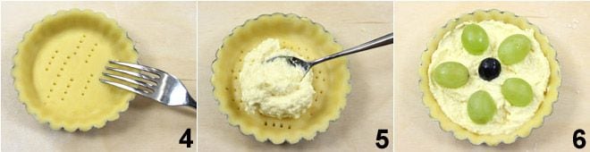 Then prick the bottom of the tartlets with the tines of a fork 4 and place a generous tablespoon of frangipane cream on each one 5, which you will then level with the back of the same spoon. Wash the white grapes and cut the grapes in half (if present, remove the internal seeds). Place the grape halves on the frangipane cream, forming the petals of a flower. Place a small black grape in the center of each flower 6.