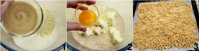 Start preparing the peach crumble with the crumble dough: place the two flours (white and almond) in a bowl, add the brown sugar 1, cinnamon, butter (cold from the refrigerator and cut into cubes), and egg yolk 2. Briefly work them with a wooden spoon, so as not to mix them completely but to leave them well crumbled, obtaining dough crumbs. Let the dough rest for 10 minutes in the refrigerator and then transfer the crumble onto a baking sheet covered with a sheet of parchment paper, trying to space out the dough 3.
