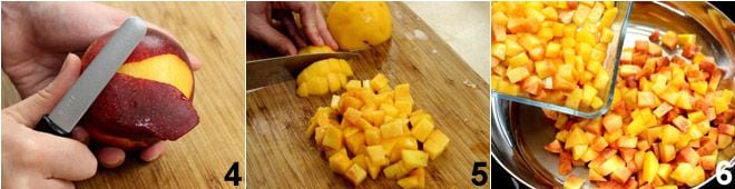 In the meantime, peel the peaches 4 and cut them into cubes 5, then place them in a pan where you have melted the butter 6, add the granulated sugar and the vanilla seeds.