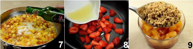 In another small pot, place the well-washed strawberries cut into quarters and cook them for 2-3 minutes with the lemon juice 8 and brown sugar. Then compose the peach crumble using individual serving glasses: lay the strawberries at the bottom, add the peach compote, and finally the crunchy crumble dough 9. Serve the peach crumble cold!