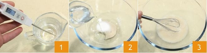 To make the crumpets, start by heating the water to reach a temperature of 113°F; check with a food thermometer 1, then pour it into a bowl with the baking powder and sugar 2, mix with the whisk 3, cover with plastic wrap, and let the mixture rest for 15 minutes at room temperature.