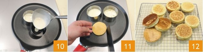 pour a ladle of batter inside 10 and cook for 10 minutes or until bubbles form on the surface, then remove the pastry ring, the batter will have taken its round shape, with the help of a spatula turn the crumpets 11 and continue cooking on the other side for another 2-3 minutes until golden. Once cooked, transfer them to a rack to cool. Your crumpets are ready to be enjoyed!