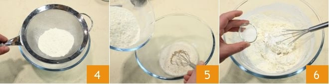 After the resting time, sift the flour 4 and pour it into the mixture with the yeast, gradually mixing with the whisk to combine the ingredients 5. Incorporate the salt and baking soda 6