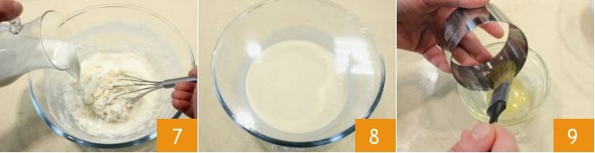 finally, add the warm milk, pouring it in a thin stream 7, continuing to mix with the whisk to avoid lumps. When the mixture is smooth, cover it with plastic wrap 8 and let it rest for 1 hour at room temperature. Then proceed with cooking: grease a non-stick pan with oil and heat it over low heat, meanwhile, brush the inside edge of an 8 cm (3-inch) pastry ring with butter 9 and place it in the center of the pan,