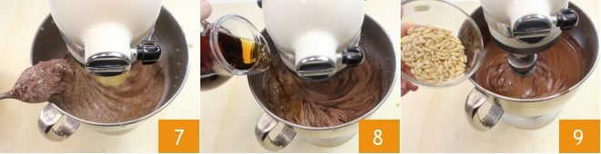 Once all the eggs have been absorbed, add the sifted powders one tablespoon at a time 7, until you obtain a homogeneous and creamy mixture. Pour the beer in a thin stream 8, always with the mixer in action. Finally, add the pine nuts 9 and work the mixture for another couple of minutes.