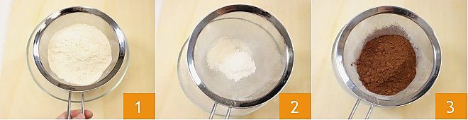 To prepare the chocolate and beer sweet cubes, start by sifting the flour 1, along with the baking powder 2 and bitter cocoa 3 into a bowl.