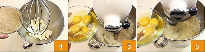 Then place the softened butter at room temperature and brown sugar in a stand mixer equipped with a whisk or use an electric mixer alternatively 4. Turn on the mixer and work everything until you get a creamy mixture. Add the eggs one at a time, always with the mixer in action, being careful to add the next egg only when the previous one has been completely absorbed into the mixture (5-6).