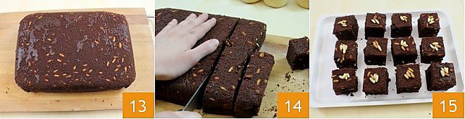 When the cake is completely cool, remove it from the pan, turn it over onto a cutting board 13, and cut it into strips 2 inches thick, then reduce each strip into small squares to get cubes measuring 2x2 inches 14. Place some pine nuts on each chocolate and beer sweet cube 15 and serve!