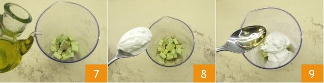 Place the cucumber cubes in a tall, narrow container, season with salt and pepper, then add the oil 7, Greek yogurt 8, and apple cider vinegar 9.