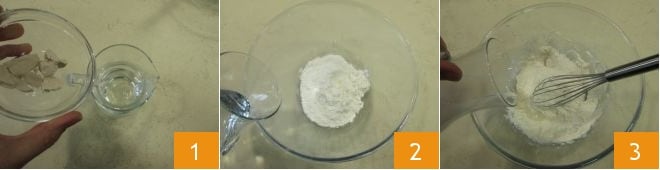 To prepare the cartoccio of cheese and flowers, start with the batter for the zucchini flowers. Dissolve the yeast in a little lukewarm water taken from the indicated amount 1. Then, in a bowl with the flour, pour the water first, mixing with a whisk 2 and then add salt, sugar, and the diluted yeast. Obtain a smooth and lump-free batter 3.