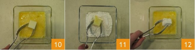 Heat the oil to 338°F-356°F in a large saucepan, ideally measuring the temperature with a thermometer. Then proceed with breading the cheese. Dip the cubes first in the beaten eggs 10, then in flour 11, and again in eggs 12.