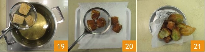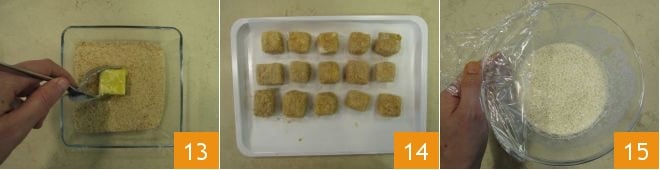 Lastly, coat in breadcrumbs 13. Gradually place the cubes on a small tray and set them aside for a moment 14. Then fry the flowers first. Remove the plastic wrap from the bubbly batter 15.