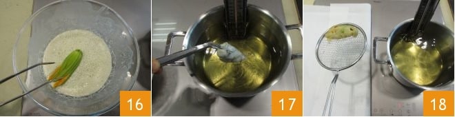 Completely immerse a couple of flowers 16 using tongs or a fork and then dip them in the oil 17. After a few minutes, when they become puffed up, the first flowers will be golden. Drain them on paper towels and cook all the others, salting them lightly 18.