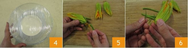 Cover with plastic wrap and let rise at room temperature for about half an hour 4. In the meantime, clean the flowers. Detach the stem 5, and the peduncles 6