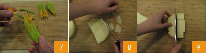 and finally the internal bud 7. Set aside for a moment and take care of the caciocavallo. Slice it to a thickness of 1.18 inches and remove the rind 8. Finally, cut into cubes of 1.18 inches 9.