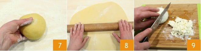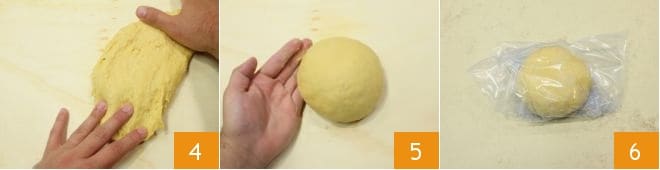 Transfer the dough to a surface and work it with your hands from the outside in 4, incorporating all the flour, and continue to knead until it is smooth and compact 5. Wrap the dough obtained in plastic wrap 6 and let it rest for about 1 hour in a cool, dry place.