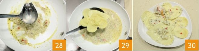 add a ladle of cooking water to the scallop sauce 28, then drain the burrata hearts into the pan 29 and sauté them for a few moments to season them. Your hearts of burrata with scallop cream are ready to be served 30!