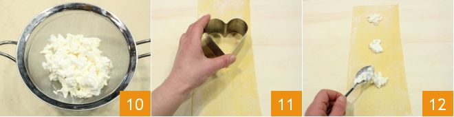 and drain it to remove excess liquid 10. Once you have prepared the sheets, lay them out on the board, place a heart-shaped pastry cutter (8x8 cm in size) on the sheet without cutting it; by pressing lightly, you will leave the tool's marks on the pasta and then be able to position the burrata filling in the center of the various shapes 11. Place a tablespoon of burrata in the center of each shape 12,