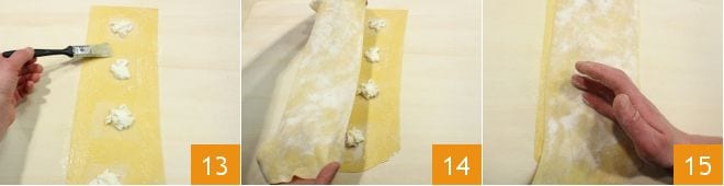 brush the sheet around the filling with water or egg white: this way the edges will stay well sealed once overlapped 13. When you have placed all the mounds of filling, cover them with a sheet of the same size as the one below 14; before sealing the edges of the ravioli, press all around the filling to remove the air 15.