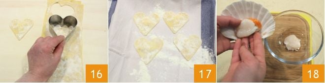 Pressing the sheets with the pastry cutter, make the burrata hearts 16 that you will lay on a clean and lightly floured cloth 17. Now prepare the scallop cream: remove the scallops from the shell 18 and remove the black part and the muscle, and collect the flesh and coral in a bowl.
