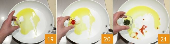 Sauté in a pan the oil, garlic 19, and minced chili pepper 20 the minced thyme 21. When the garlic is golden, add the scallops and corals to the pan.