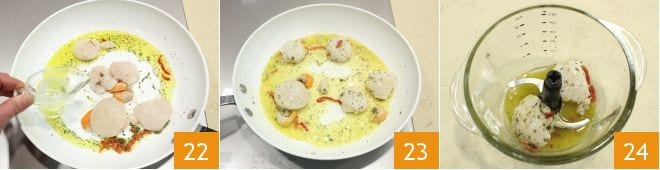 Pour the white wine over the scallops and let it evaporate 22. When the scallops are cooked 23 (it will take a few minutes), pour them along with the cooking liquid into a blender 24.