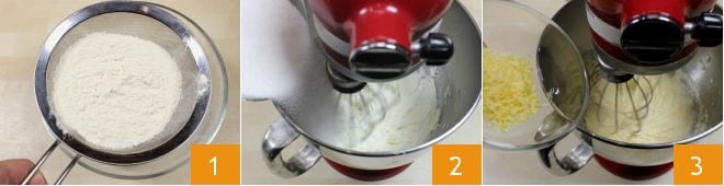 To prepare the limoncello cupcakes, start by sifting the flour and baking powder with a fine mesh sieve 1. Then, place the softened butter and sugar in a stand mixer 2; turn on the beaters to mix the ingredients (if you don't have a stand mixer, you can use an electric hand mixer). Add the grated zest of one untreated lemon to the batter 3 and continue mixing.