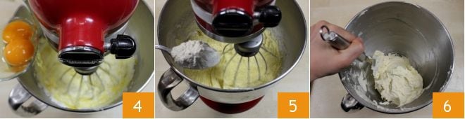 Add the 2 eggs, one at a time 4, then add a pinch of salt and finally the sifted flour with the baking powder, gradually using a spoon 5. Then remove the mixture from the stand mixer and mix with a spatula to combine the ingredients until you obtain a homogeneous batter 6.
