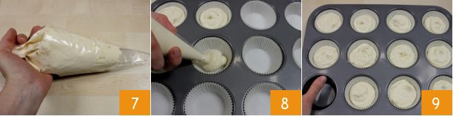 Transfer the mixture into a piping bag 7. Then take a 12-muffin tray and line each mold with a paper liner. Pour the mixture into each liner 8, being careful not to exceed halfway 9, so that when baked, the cupcakes will reach the edge of the liners. Bake in a preheated static oven at 350°F for 20 minutes (320°F for 15 minutes if using a convection oven).