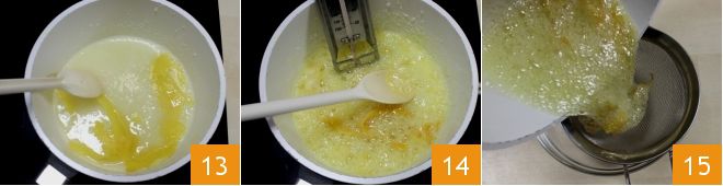 Turn on the low heat and also add the peels of 2 whole lemons and continue stirring 13. When the sugar has dissolved, let the syrup boil without further stirring and check with a thermometer that it reaches 250°F 14. Then turn off the heat and strain the syrup obtained with a fine mesh sieve, collecting it in a small bowl 15.
