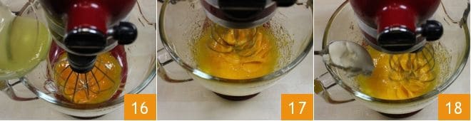 In a stand mixer, place the egg yolks and start the beaters (if you don't have a stand mixer, you can use a large bowl and an electric hand mixer). Then add the hot syrup in a thin stream 16. Let the ingredients whip until completely cool 17. While the mixture cools, in a small bowl, work the cold but softened butter to make it creamy. Gradually incorporate the buttercream into the yolks with the syrup, continuing to mix with the beaters 18.