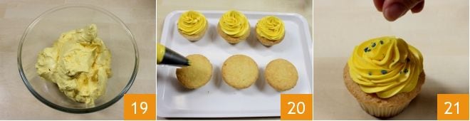 Transfer the smooth and homogeneous cream into a small bowl 19. If you are not using it immediately, place it in the fridge covered with plastic wrap until you decorate the cupcakes. Then unmold the cupcakes, put the buttercream in a piping bag with a star tip, and start decorating them with a swirl of cream 20. You can further garnish the limoncello cupcakes with colored sprinkles or other decorations of your choice 24. Store the limoncello cupcakes in the refrigerator until serving time!