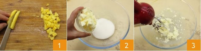 To make the pina colada cupcakes, peel the fresh pineapple and cut 170 grams (6 oz) into small cubes 1, place the softened butter and sugar in a bowl 2, and beat them with an electric mixer to obtain a cream 3