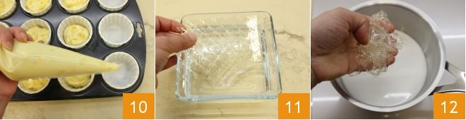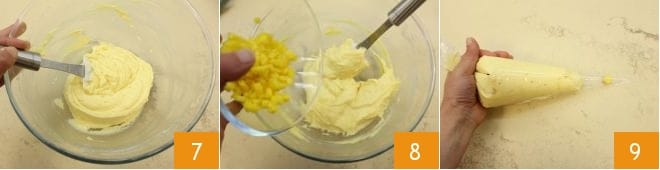 Mix until the powders are well blended 7 and finally add the fresh pineapple cubes 8. Transfer the mixture into a piping bag without a nozzle 9, then place paper cupcake liners in a 12-cupcake pan.