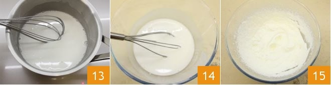 stir with a whisk to dissolve the gelatin 13. Transfer the coconut milk to a bowl 14, cover with plastic wrap in contact with the surface, and let the cream set in the refrigerator for 1 hour. After this time, whip the fresh liquid cream with powdered sugar 15