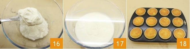 and add it to the coconut milk 16, mix with a spatula to combine, cover the cream with plastic wrap 17, and let it set again in the refrigerator for 30 minutes. After the resting time, take the now-cooled cupcakes 18, remove them from the multiple mold while keeping the paper liners.