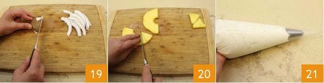 Create the decorations: cut the coconut into wedges 19 and the pineapple slices into triangles 20. Transfer the coconut cream into a piping bag with a star nozzle 21