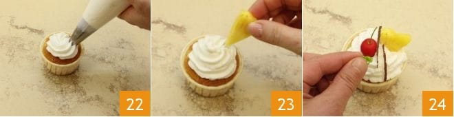 and squeeze a tuft on each cupcake 22, garnish with the pineapple pieces 23, a cherry drained from the preserving liquid, coconut slices (or desiccated coconut), and mint leaves 24. Your pina colada cupcakes are ready!