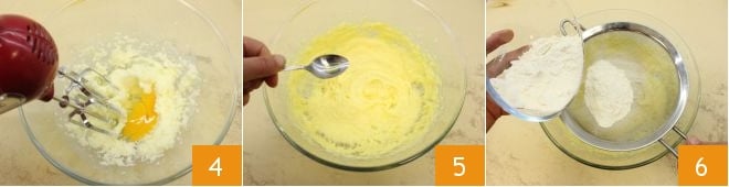 then add the eggs 4 and when they are well incorporated into the mixture, pour in the rum flavoring 5, mix with a spatula, and also add the sifted flour 6 and baking powder.