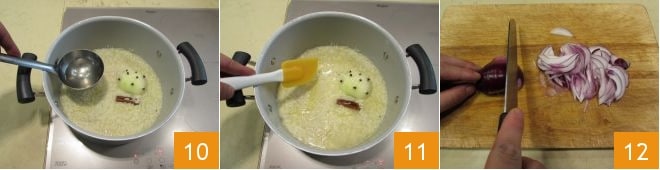 Add the whole cinnamon stick, then pour in ladles of water to aid cooking 10: add a ladle when the previous one has been absorbed: it will take about 10-12 minutes (or alternatively, adjust according to the instructions on the rice package you buy). Salt and pepper to taste. Do not stir the rice too much: it will be necessary to stir it from time to time only to prevent it from sticking to the bottom of the pot. Just before it's ready, give it a final stir 11 and remove the onion and cinnamon stick. Set it aside and now proceed with the preparation of chickpeas and pumpkin: take an onion, peel it, then cut it into very thin wedges 12.