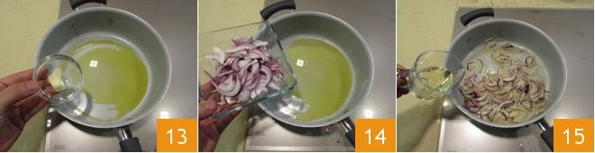 In a non-stick and wide-bottomed pan, heat the oil and brown a peeled whole garlic clove 13. When it is golden, remove it and add the onion to the pan 14. Deglaze with white wine and let the onion wilt 15.