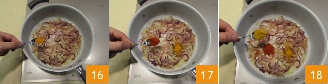 When it is well wilted and the liquid evaporated, add the turmeric 16. Also season with paprika 17 and curry 18 (the amount of these ingredients can be adjusted based on your personal taste and the intensity of the flavor of the spices you use).