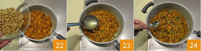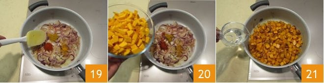 Mix the ingredients well 19. At this point, add the pumpkin: sauté it for about 4 minutes 20, adjusting with salt and pepper and being careful to stir it well to avoid sticking to the bottom of the pan. Then pour in the water to aid the cooking of the pumpkin 21 and continue cooking over low heat for about 7-8 minutes.