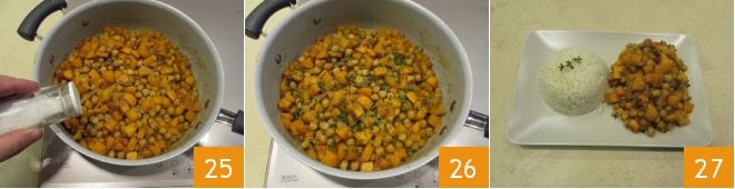 Adjust with salt 25 and pepper: pumpkin and chickpeas are now ready 26. At this point, you can plate your vegetarian curry with pumpkin and chickpeas: if you prefer, you can shape the pilaf rice in individual aluminum molds for a stylish plating 27!