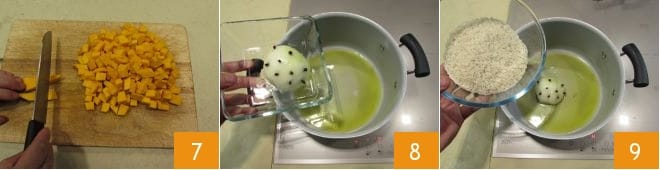 Cut it into cubes the same size as the chickpeas: this will help to achieve the same cooking time as the chickpeas. Set the diced pumpkin aside 7. Take a pot and sauté with a drizzle of oil half an onion pierced with cloves 8. This technique prevents the cloves from dispersing in the pot (they are used for flavoring) since they will be removed at the end of cooking. Then add the rice 9 and toast it for a few minutes, stirring.