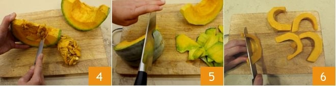 While the chickpeas are cooking, prepare the Vegetable broth, then focus on preparing the pumpkin: remove the seeds and inner strings 4, eliminate the outer skin 5. Then cut it into slices not too thick 6.